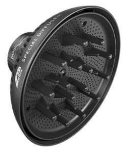La sua dimensione ottimale e la distribuzione dei fori sono state progettate per agevolare il lavoro del parrucchiere, creando una perfetta combinazione tra temperatura e quantità di aria emessa che permette di ottenere asciugature naturali dei capelli ricci in minor tempo, asciugando rapidamente le radici dei capelli senza seccare le punte, riducendo quindi l’effetto crespo.